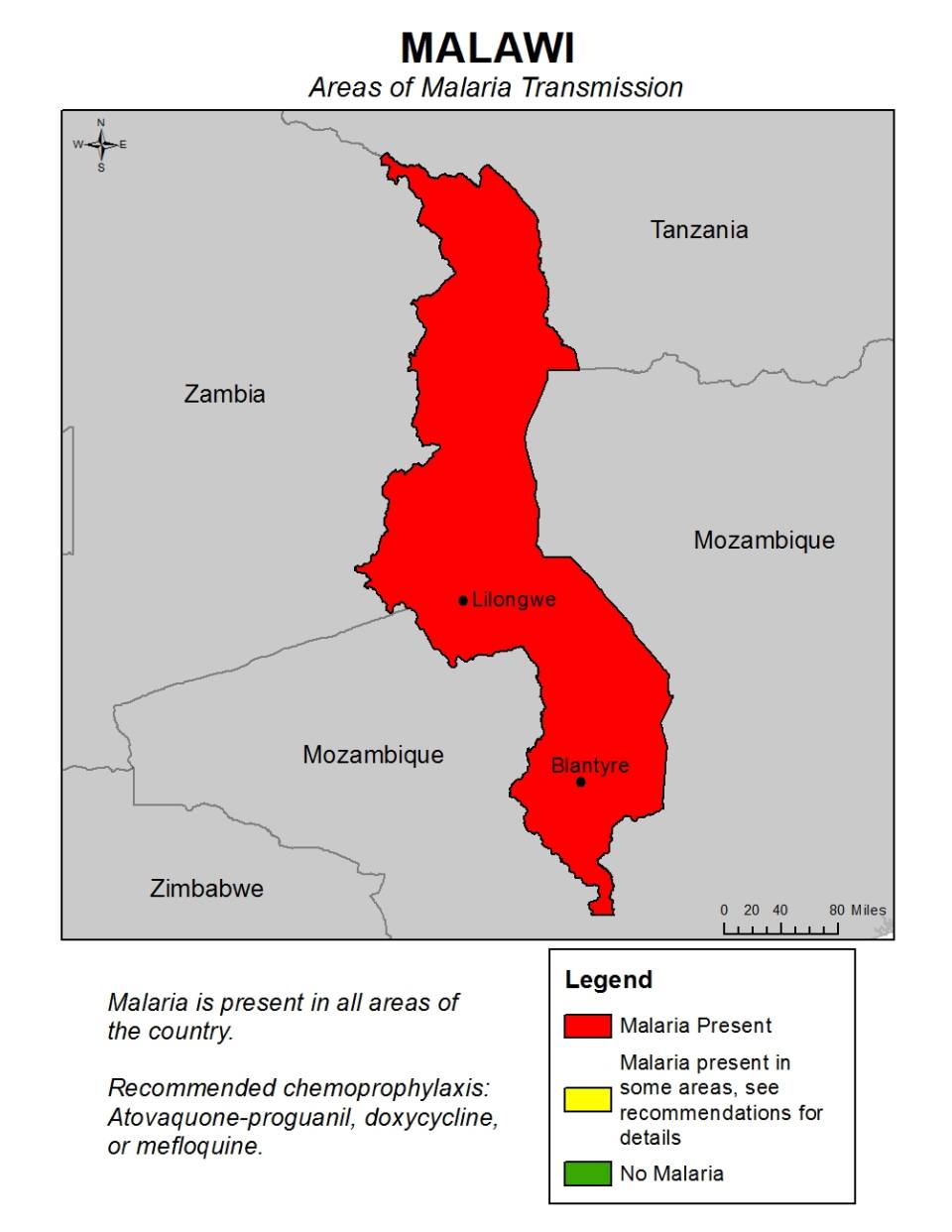 Malaria is present throughout the year in all areas of Malawi.