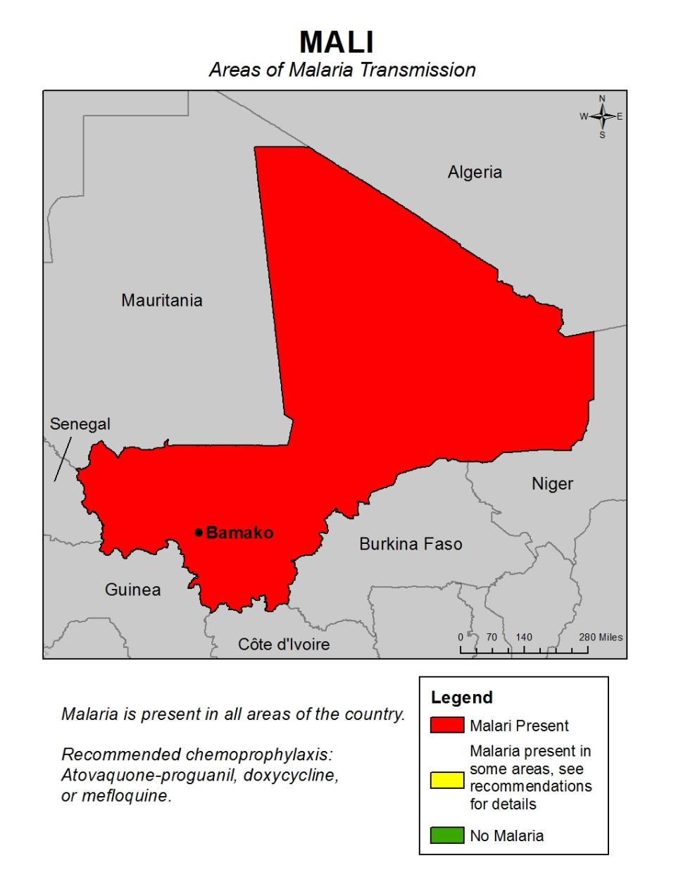 Malaria is present throughout the year in all areas of Mali.