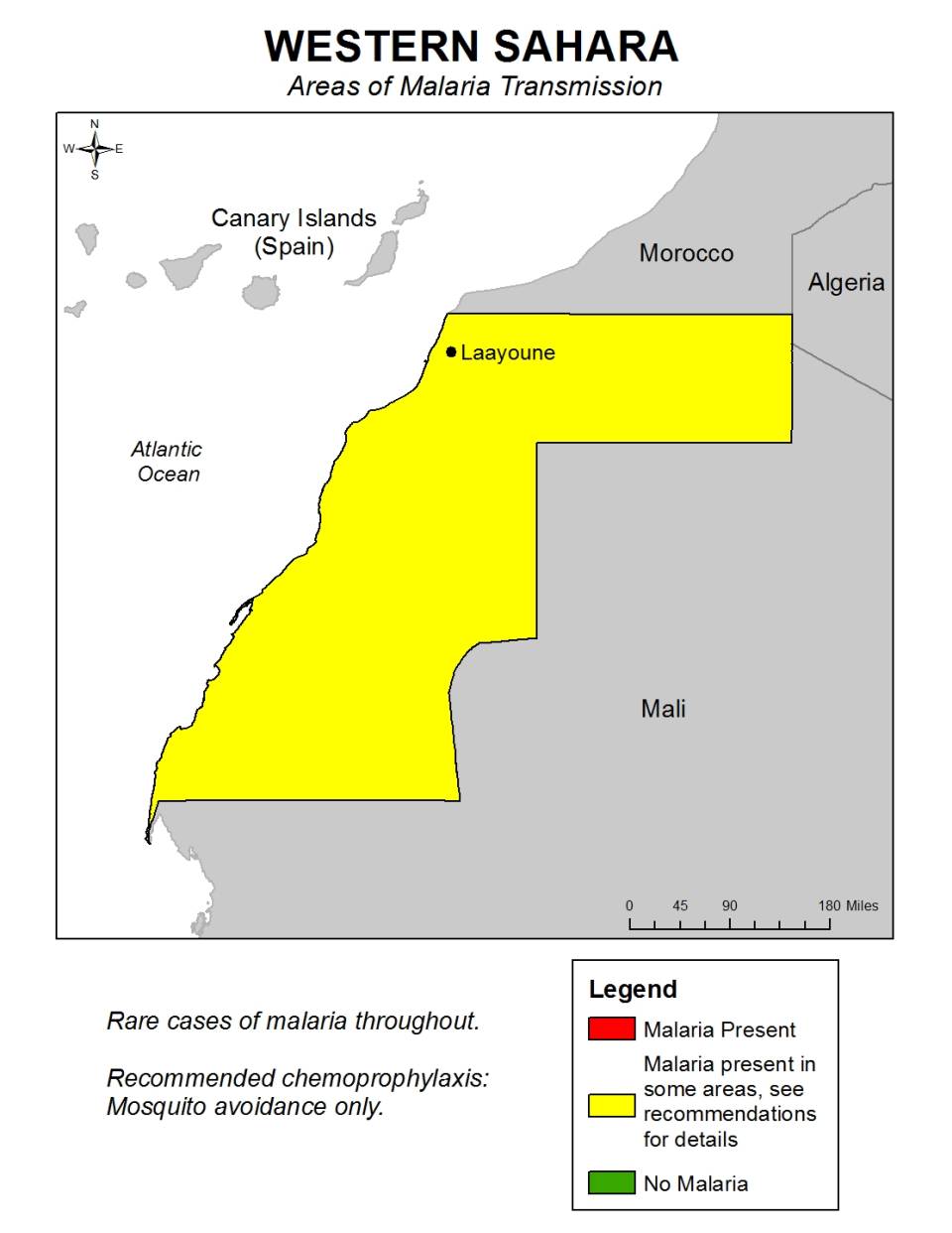 The risk of malaria is low in Western Sahara. Medications to prevent malaria are generally not recommended for travellers, but you should take care to avoid insect bites and see your doctor if you develop a flu-like illness after your trip.