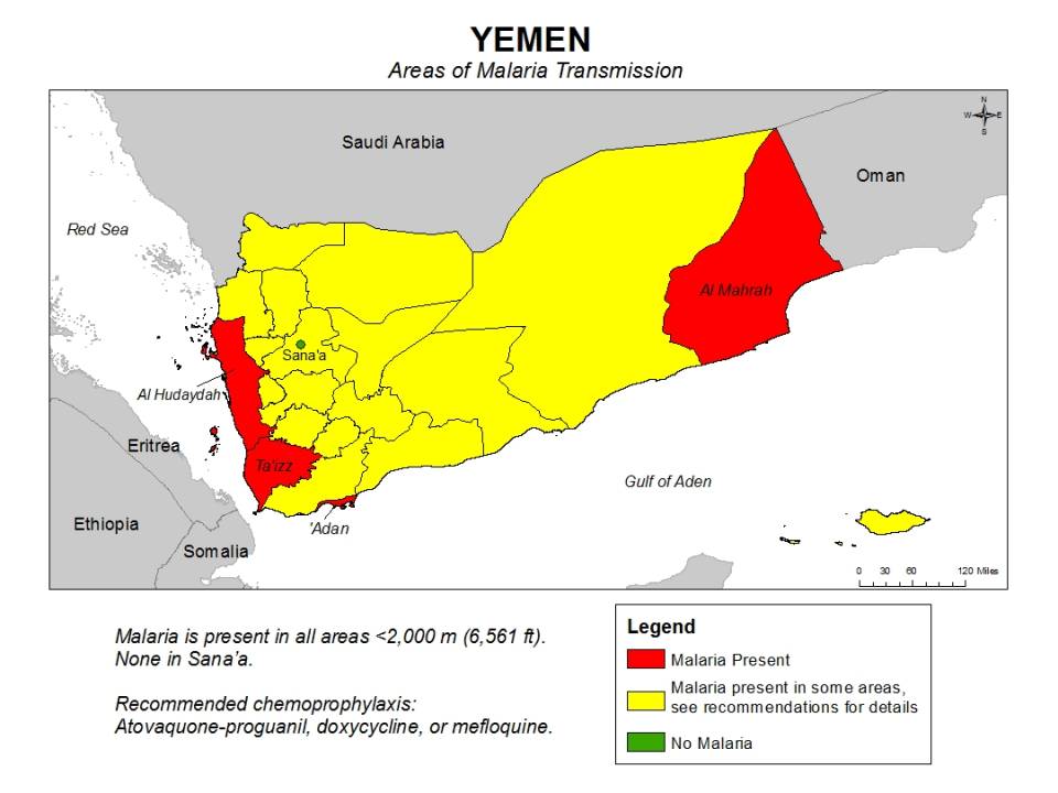Malaria is present throughout the year in all areas below 2,000 metres; no risk in Sana’a.
