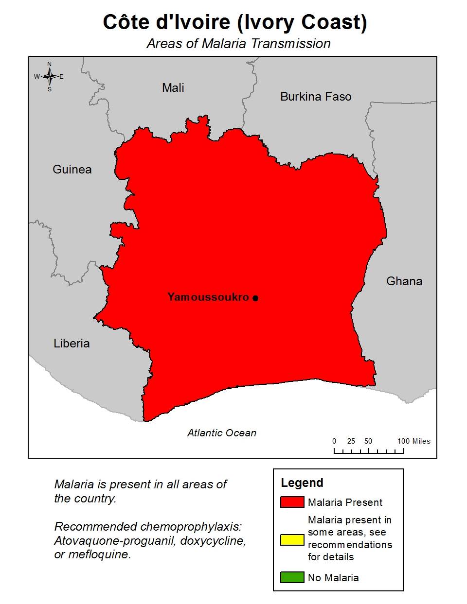 Malaria is present throughout the year in all areas of Côte D’Ivoire (Ivory Coast).