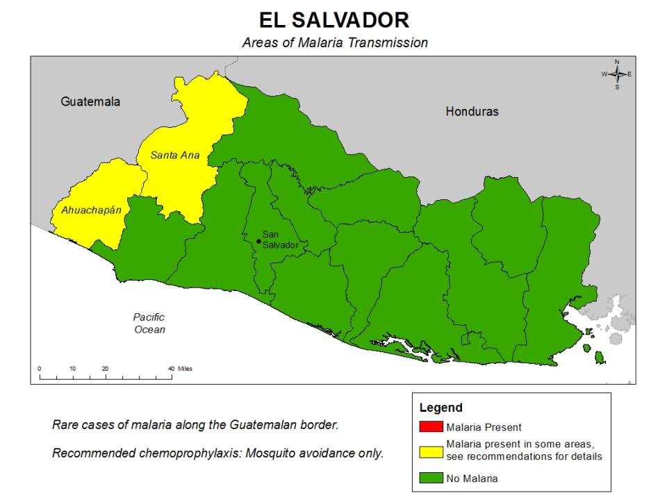 Malaria is present throughout the year in rural areas of Santa Ana, Ahuachapán and La Unión departments; no risk in the city of San Salvador.