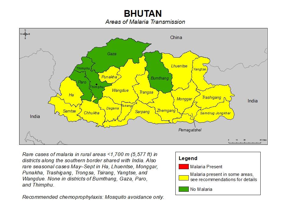 Malaria is present throughout the year in the 5 southern belt districts of: Chirang, Samchi, Samdrup Jongkhar, Sarpang and Shemgang at elevations less than 1,700 metres2.