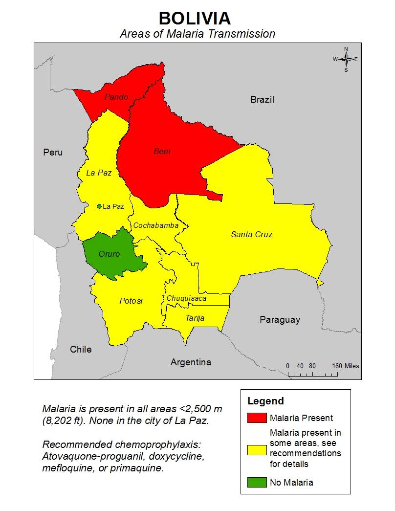Malaria is present throughout the year in the following departments: Beni, Chuquisaca, Cochabamba, La Paz, Pando, Santa Cruz and Tarija. No risk in city of La Paz or at elevations greater than 2,500 metres.