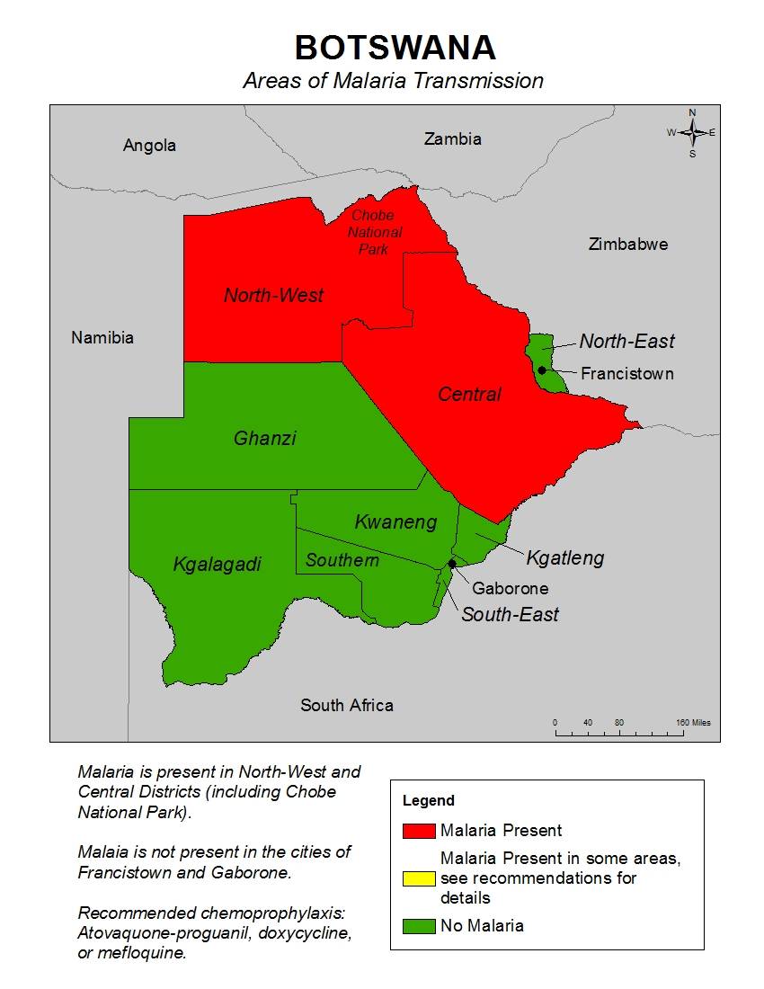 Malaria is present from Nov-Jun in areas north of 22°S in the northern provinces of Central, Chobe, Ghanzi, Ngamiland and including safaris to the Okavango Delta area. No risk in the city of Gaborone.