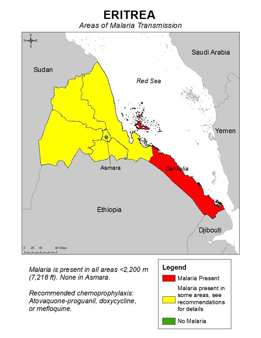 Malaria is present throughout the year in all areas 2,200 m elevation and below; no risk in Asmara.