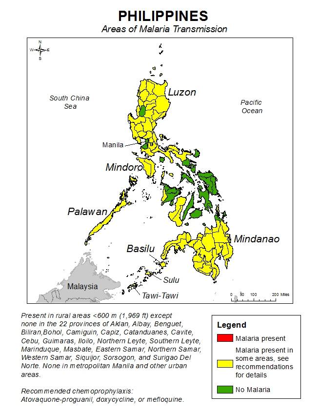 Malaria is present throughout the year in all areas below 600 metres elevation, except no risk in Bohol Island, Borocay Island, Catanduanes Island and Cebu Island. No risk is considered to exist in Manila or other urban areas..